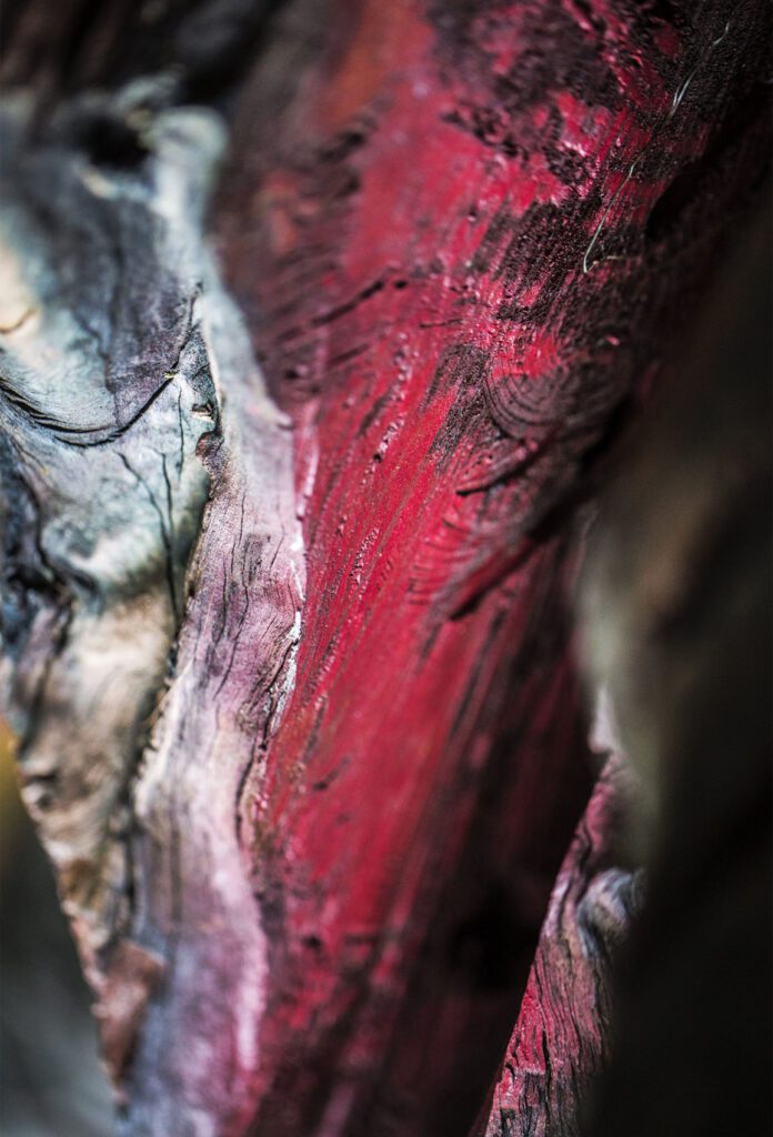 In this series, the lens draws close to textures as if listening to confidences: there are lines that ripple like tides, tears where light seeps timidly, crimson spaces that recall raw flesh — as if the trunk revealed not only its bark but also its entrails in intense red, opening breaches in the deep brown of the wood.